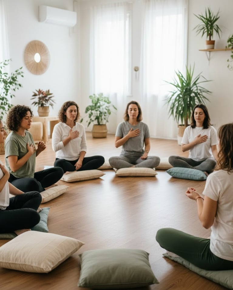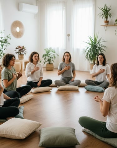 Les séances de groupe offrent un moment de partage et de connexion à soi, dans une atmosphère conviviale, respectueuse et bienveillante.